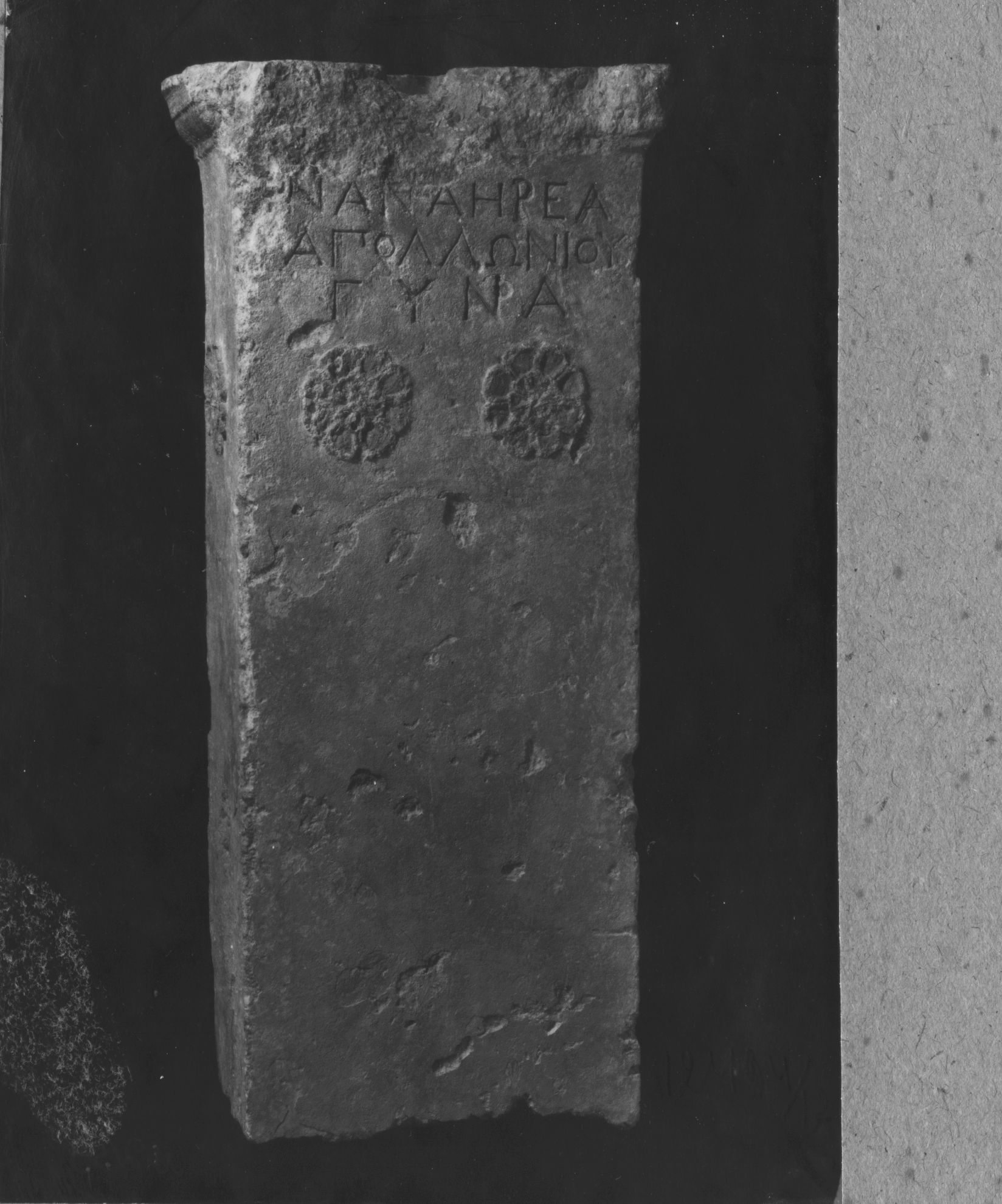 Stele with a cornice (missing on the front), which has an aperture (6 x 7 cm) for the attachment of a pediment or anthemium. Broken off at the bottom. The front and sides are adorned with relief rosettes. Between the cornice and rosettes: three-line inscription is cut and traced in black paint. On the sides: pained ribbons.